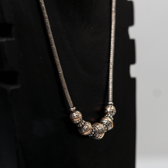 Kalung bola silver merupakan kalung berbahan dasar perak bakar dengan kombinasi emas 18 karat dan dibuat secara handmade dengan ukiran bali yang khas.