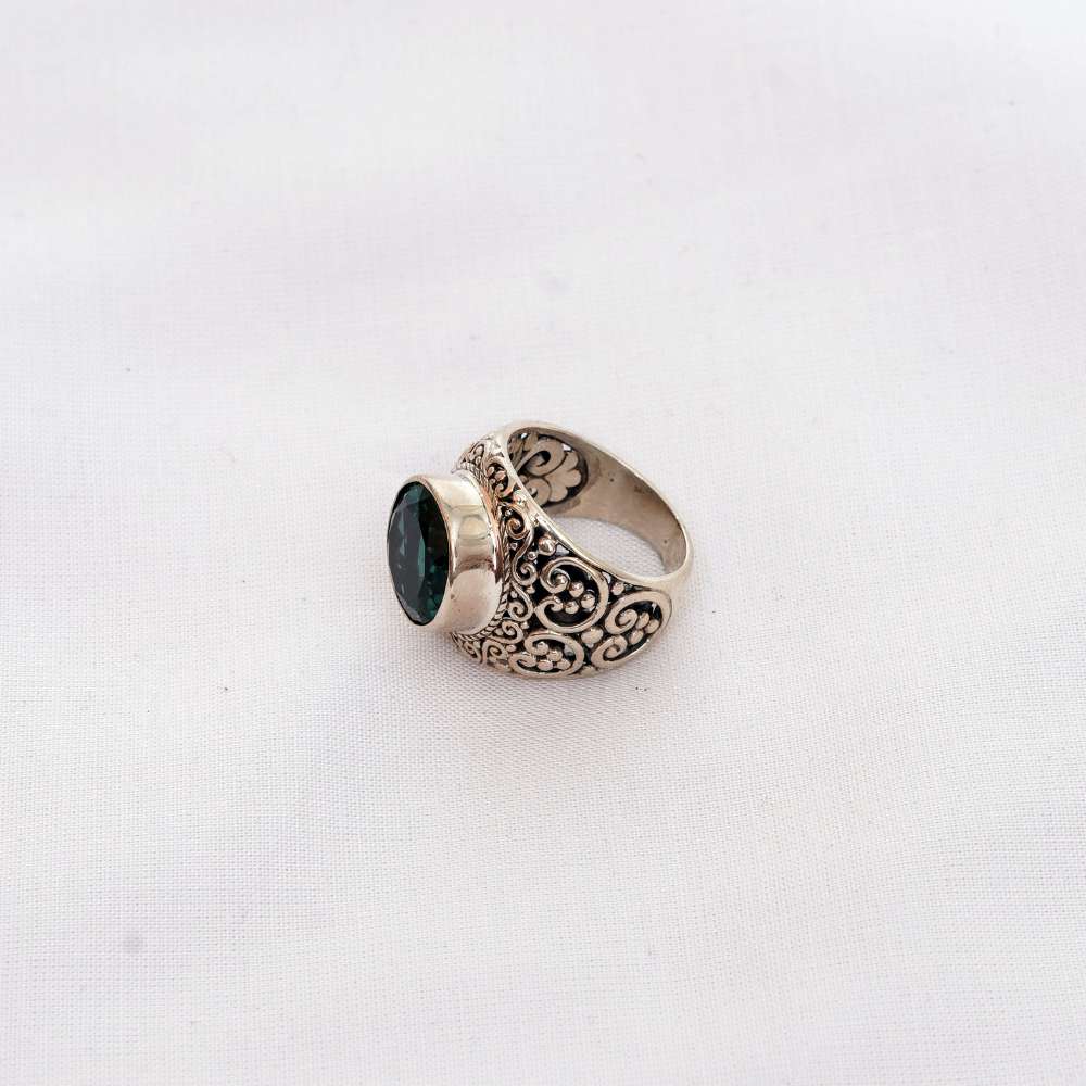 Di kombinasikan dengan batu permata zamrut hijau kebiru-biruan yang merupakan jenis batu yang berkaitan dengan cakra kelima, terkesan elegan dan terlihat glamour.