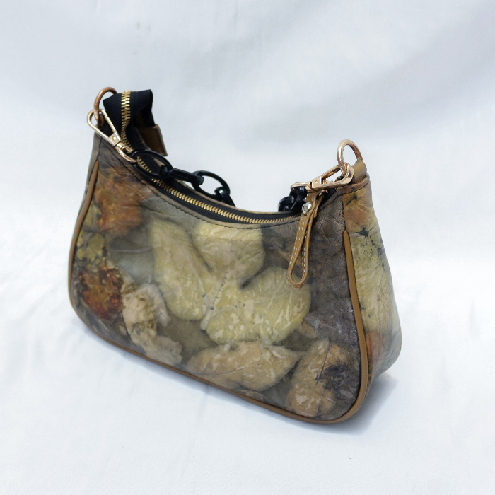 Terinspirasi dari tas tangan prada yang mungil, cocok sebagai tas tangan atau selempang. Terbuat dari kulit domba yang telah diwarna dengan teknik Ecoprint
