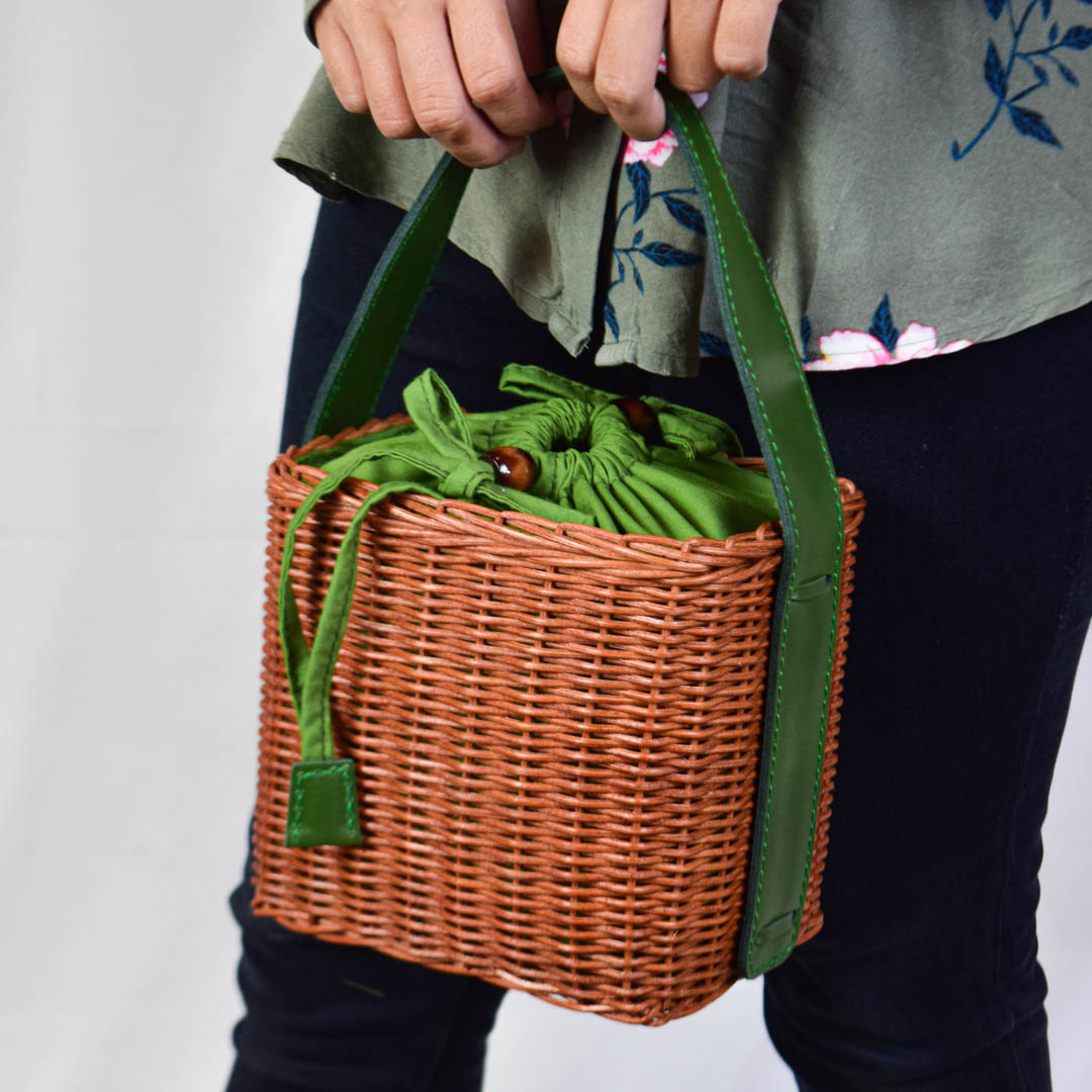 ANYAMAN rotan membentuk kubus dan potongan kulit yang menempel di kedua sisi bodinya menjadikan Yerui tas jinjing yang bernuansa simple.