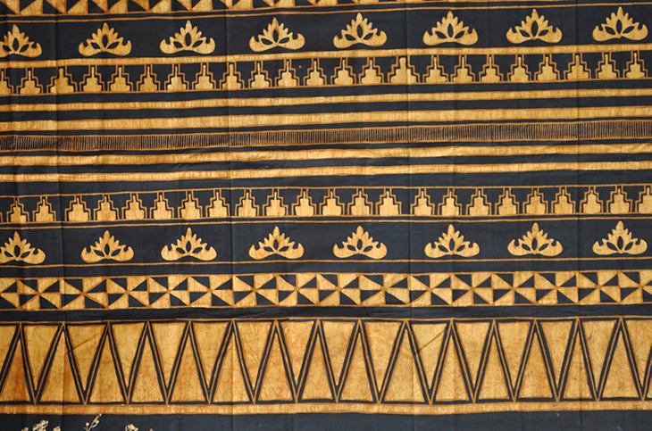 Makna Motif: Motif Tapis diadopsi dari kain tapis yang merupakan kain adat Lampung, memiliki makna simbolis sebagai lambang kesucian yang dapat melindungi pemakainya dari segala kotoran dari luar. Selain itu, dalam pemakaiannya kain tapis juga melambangkan status sosial pemakainya. Celugam adalah kain khas Lampung Barat yang berbentuk potongan potongan kain segitiga berwarna merah, oranye, hitam dan putih menyatu menjadi motif-motif unik dan antik.