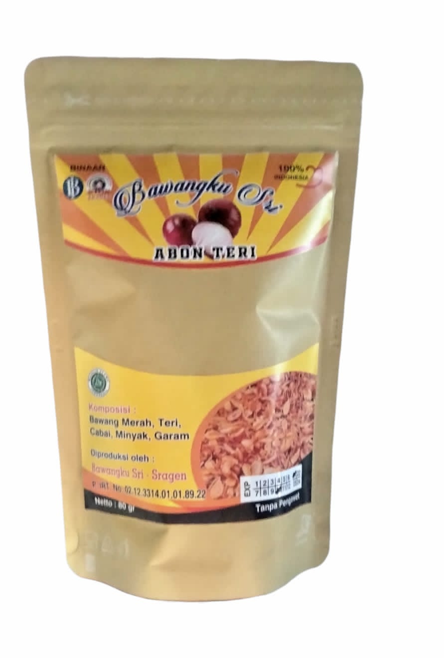 Bawang goreng dengan variasi rasa abon teri. Bawang goreng ini memiliki perpaduan rasa gurih asin dan agak sedikit pedas. Bawang goreng ini paling cocok untuk lauk makan anda