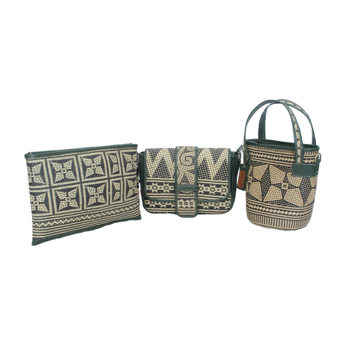 Tas anyaman berbahan rotan dan kulit sapi dengan motif khas Kalimantan Utara
