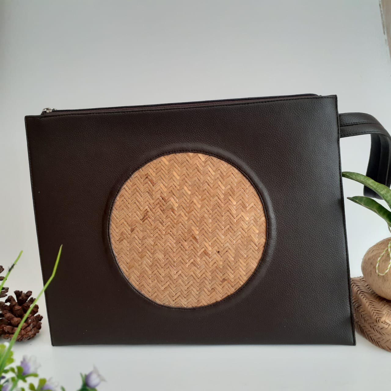 Anyaman Kulit Bili/bemban Yang Di Jahit Dengan Kombinasi Kulit Sintetis Mengunakan Mesin Jahit Industri.