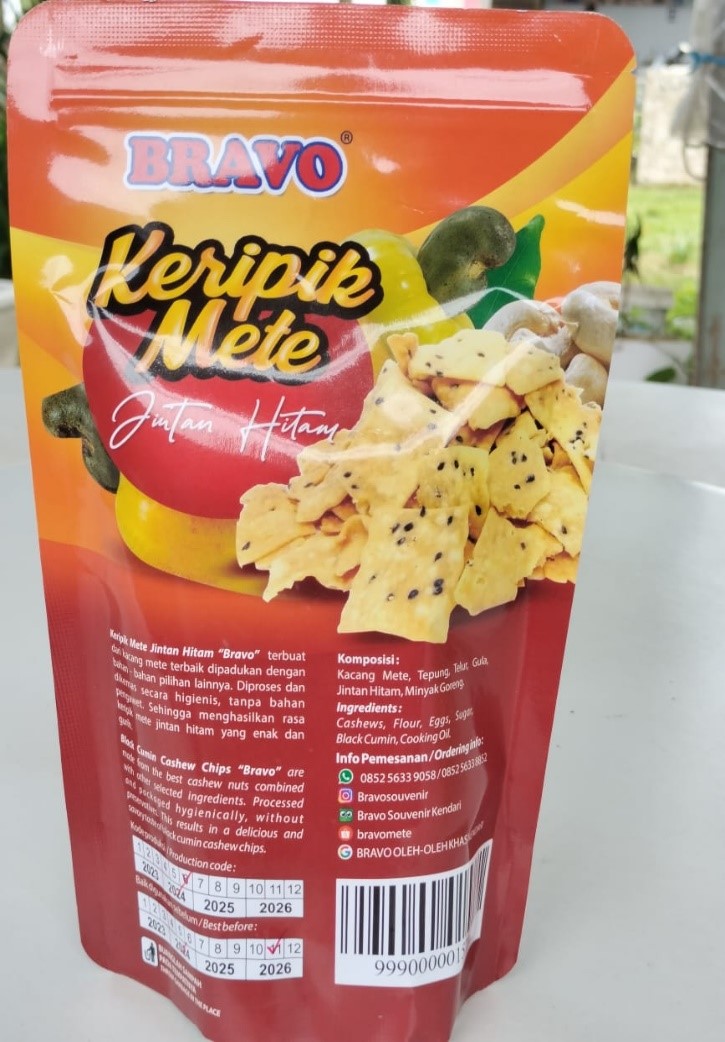 Kripik mete jintan hitam terbuat dari kacang mete pilihan, dipadukan dengan bahan- bahan lainnya dan tanpa tambahan bahan pengawet sehingga menghasilkan rasa kripik mete jintan hitam yang enak dan gurih.