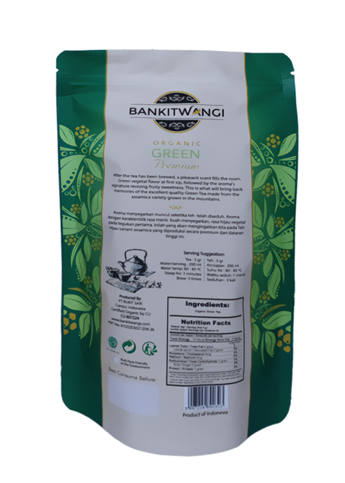 Green Tea Premium Organik dari Bankitwangi berasal dari Teh pilihan dan proses untuk mempertahankan aroma dan kesegaran Teh. Green tea mengandung sebagian besar kandungan katekin yang bersifat antioksidan. (Bankitwangi's Organic Premium Green Tea is derived from selected teas and processed to preserve the aroma and freshness of the tea. Green tea contains mostly catechins which are antioxidants)