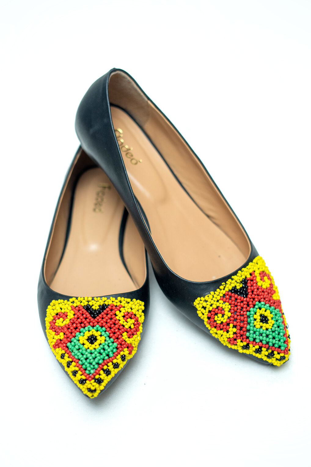 Sepatu manik ini dibuat dengan motif tradisional khas Dayak Kalimantan Timur tapi di desain dengan trend kekinian sehingga bisa dipakai oleh segala usia tua & muda. Dibuat oleh para pengrajin manik perempuan di kecamatan Anggana kemudian dijahit oleh penjahit sepatu 2 orang laki laki