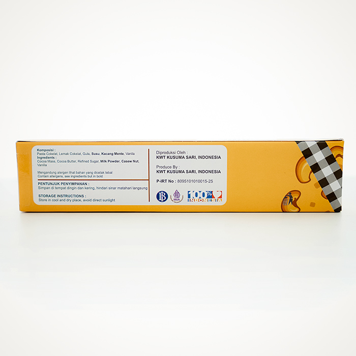 Kandungan Bahan: Pasta Cokelat, Lemak Cokelat, Gula, Susu,Kacang Mente, Vanila