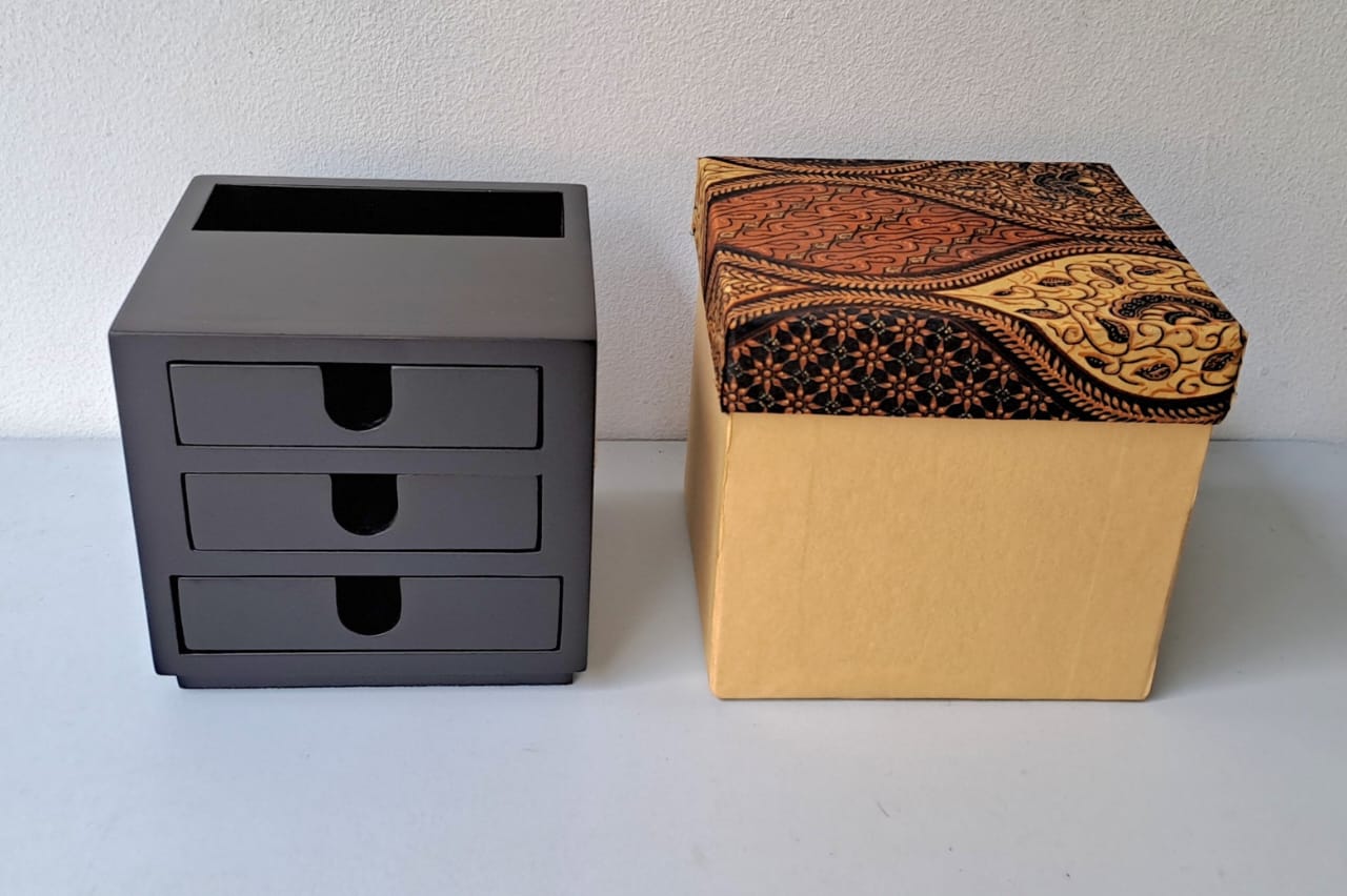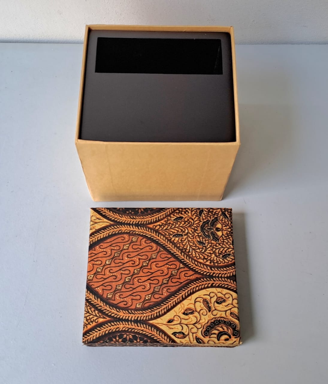 Terdapat plat ornamen wayang, di dalam box tutup batik