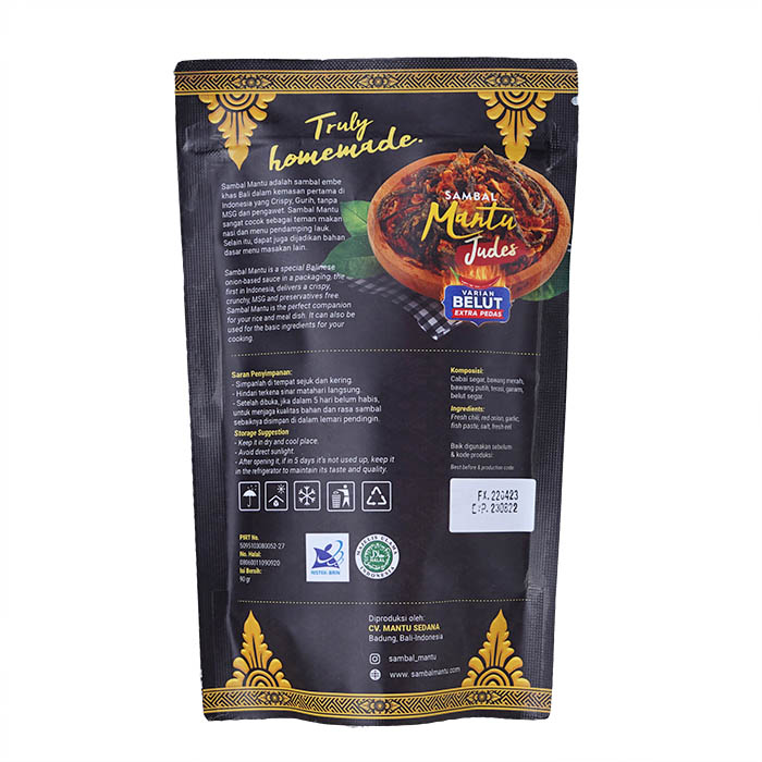 Sambal Mantu Varian Belut Judes Pouch memiliki level pedas ESTRA PEDAS dengan campuran Belut Crispy di dalamnya. Diproduksi secara modern dengan menggunakan bahan-bahan berkualitas dan resep tradisional khas Bali. Dikemas dengan menggunakan kemasan saset. 1 pouch isi 6 saset. Cocok digunakan sebagai salah satu oleh-oleh khas Bali, bisa juga digunakan pada saat traveling, ibadah haji, perjalanan dinas dan lain-lain.
