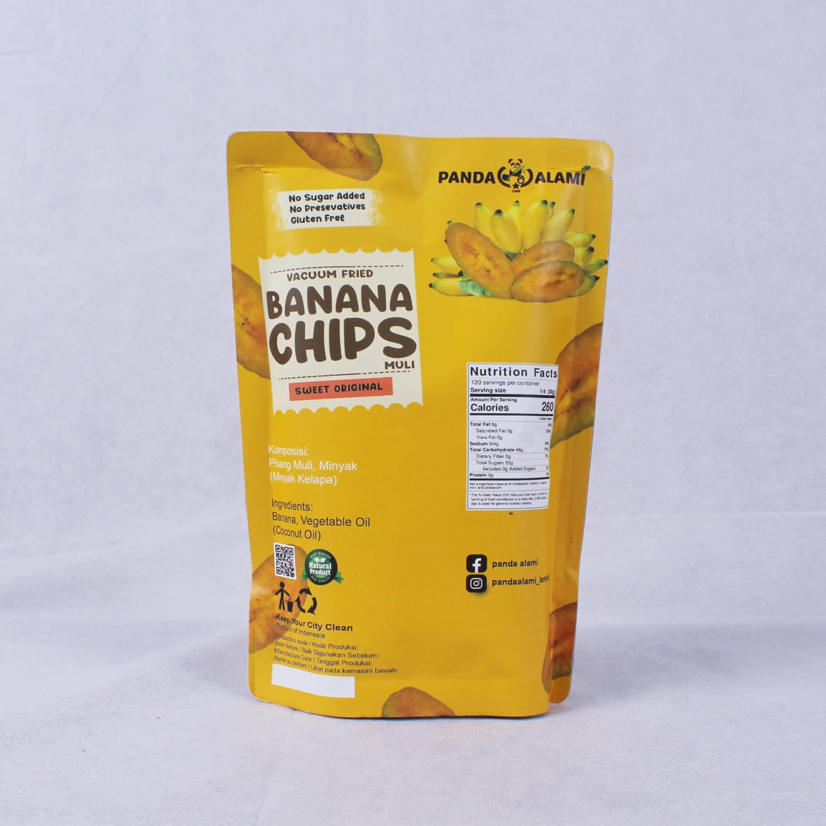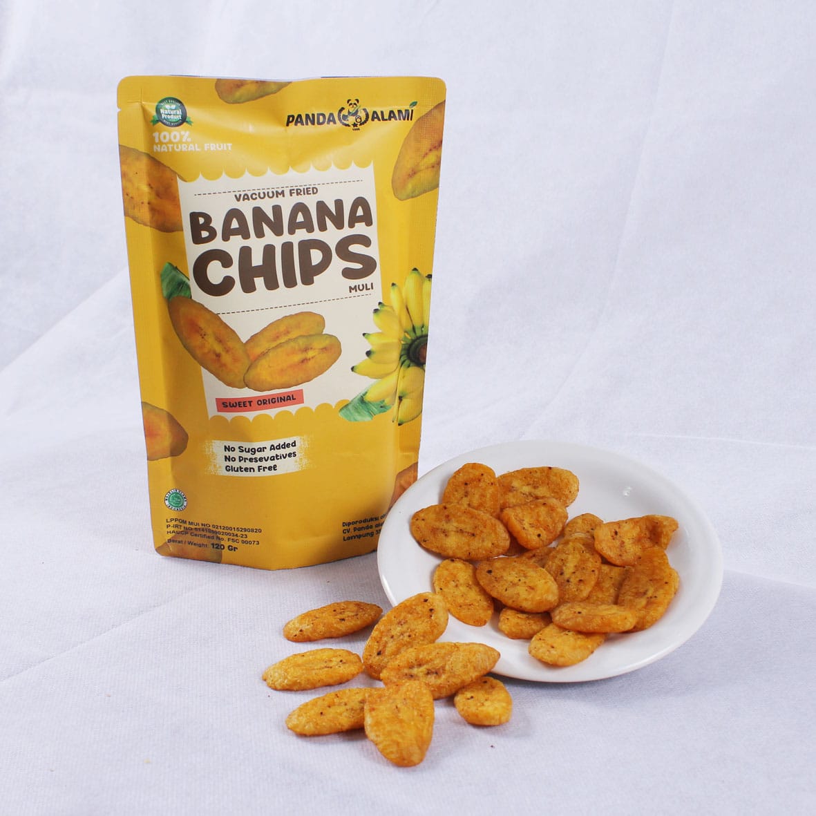 Banana Chips produk makanan ringan yang terbuat dari Buah Pisang Muli dan di goreng menggunakan minyak kelapa, dikemas menggunakan aluminium foil.