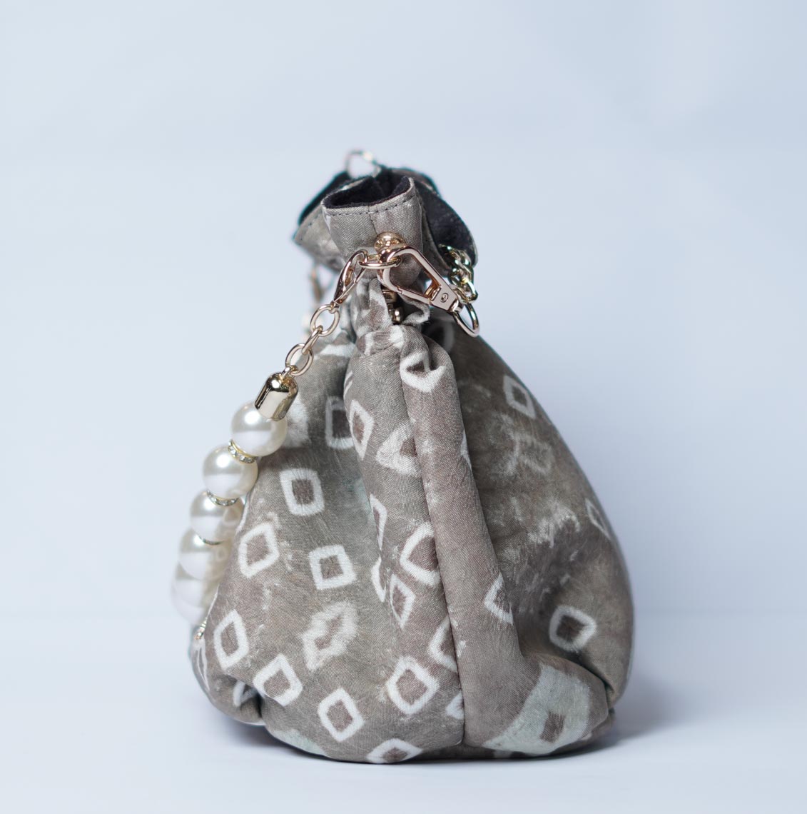 tas pesta dengan jinjing mutiara bahan kain jumputan pewarna alam, tampil elegan dengan warna yang lembut tetap terkesan mewah dengan jinjing mutiara nya.