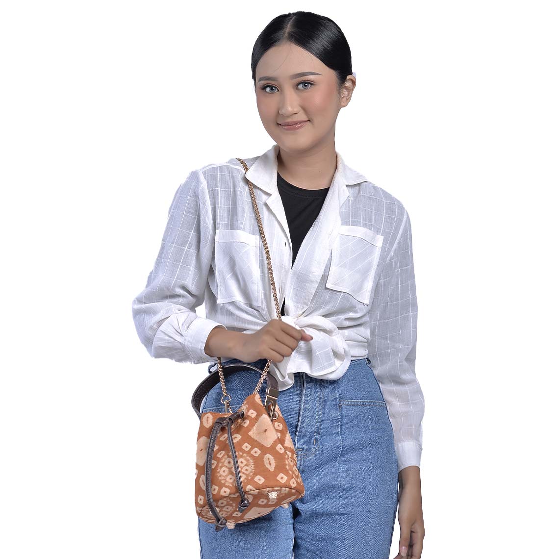 Kain gambo dengan bahan pewarna alam gambir selalu tampil unik dengan warna nya yang natural, di kreasikan menjadi mini bucketbag yang unik sehingga cocok untuk acara kasual atau santai