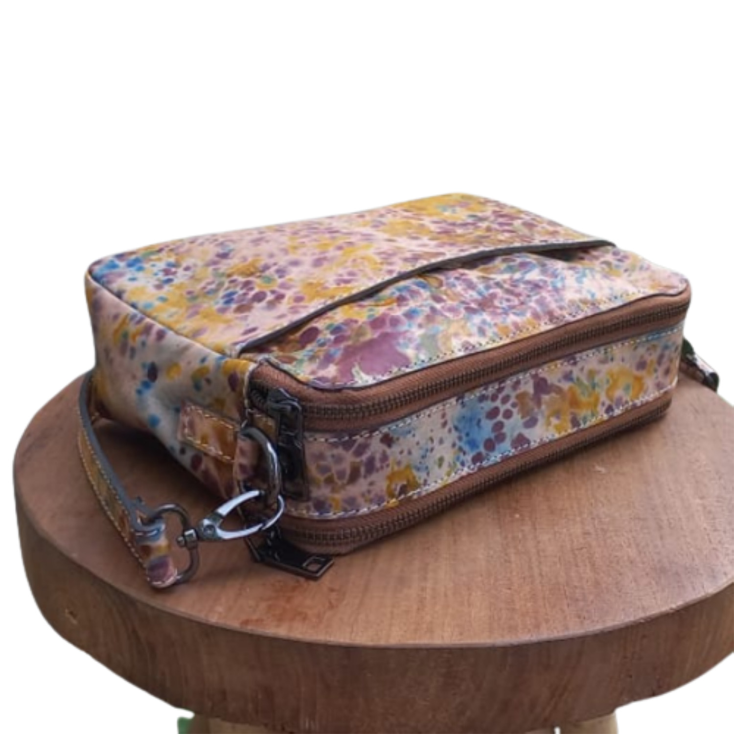 Material Kulit sapi asli yang terlukis didalam air dengan teknik inovasi finishing pewarnaan kulit sapi yang berbeda dan unik serta limited,pertama dan satu-satunya di Indonesia,teruji lab dan ramah lingkungan.