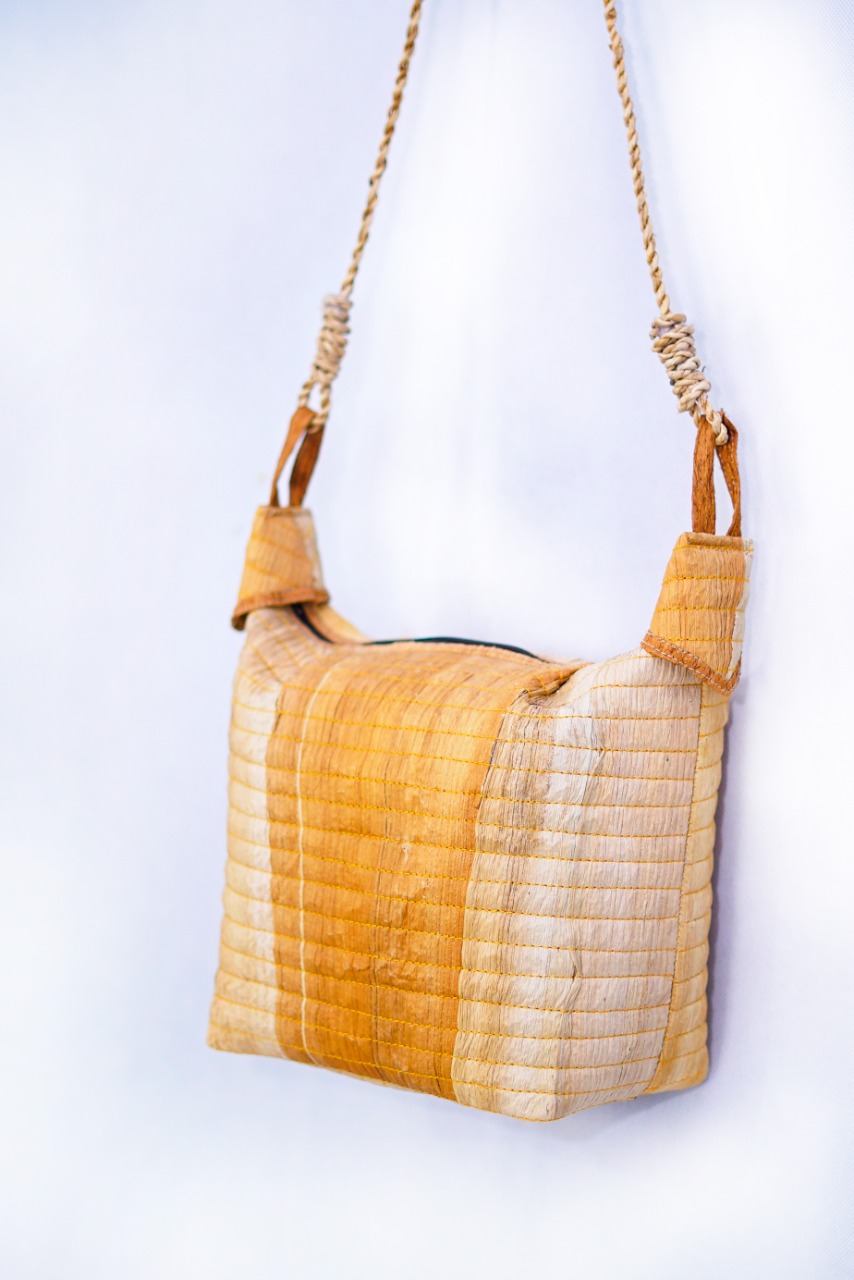 Tas santai tali panjang berbahan gedebog pisang dengan aksen kulit kayu