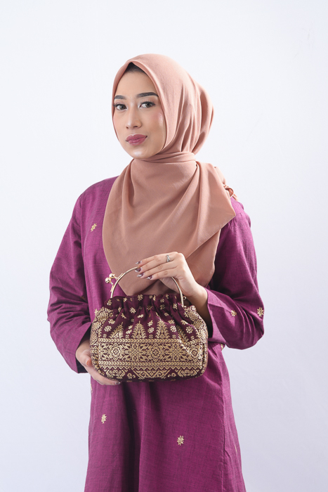 Terbuat dari kain songket asli Palembang, dilengkapi dengan rantai panjang 105cm