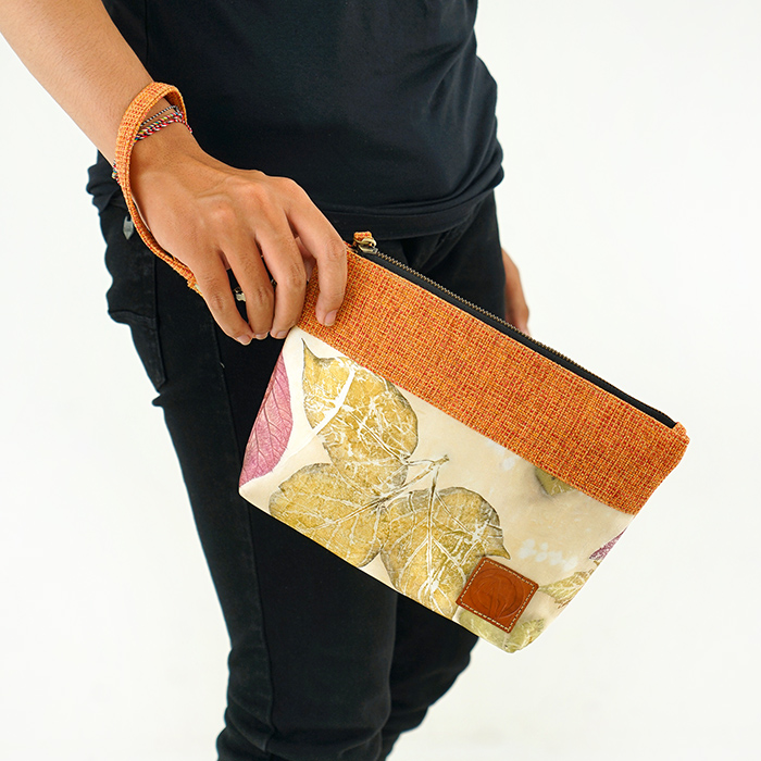 Pouch Ecoprint terbuat dari kain denim/sutra mix goni premium. Produknya mencetak motif natural (daun, bunga dan pewarna alami) yang disebut eco prints. Pekerjaan dilakukan di atas kain, dengan menggunakan produk ini diharapkan dapat mendukung kehidupan hijau dengan mengurangi pewarna sintetis yang menghasilkan polutan berbahaya bagi bumi kita. Namun, Anda tetap bisa tampil fashionable dengan menggunakan produk ini sekaligus melindungi bumi.