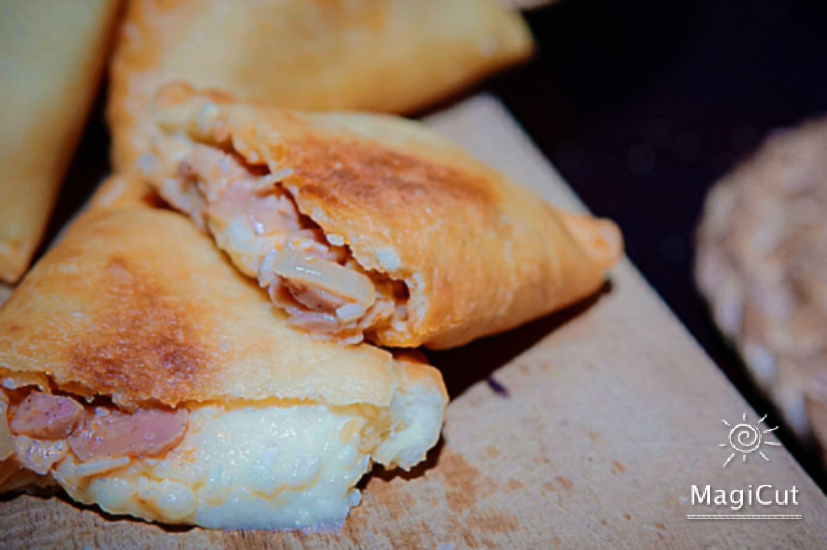 Berisikan daging tuna cincang ditambah smoked beef cincang dan keju dengan rasa yang pedas jadi kurang cocok untuk anak-anak