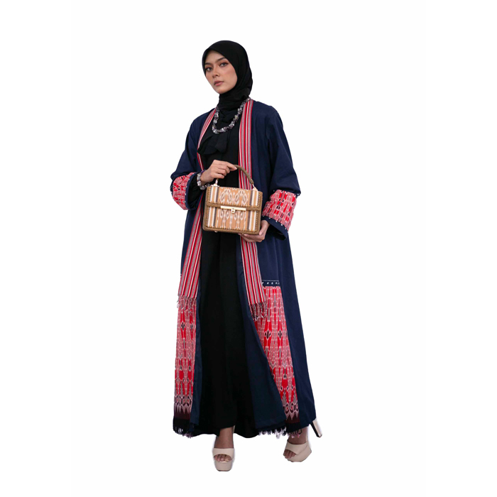 Jenis Bahan: Benang rajut nilon merek Peniti, kain tenun ikat Dayak Sintang.