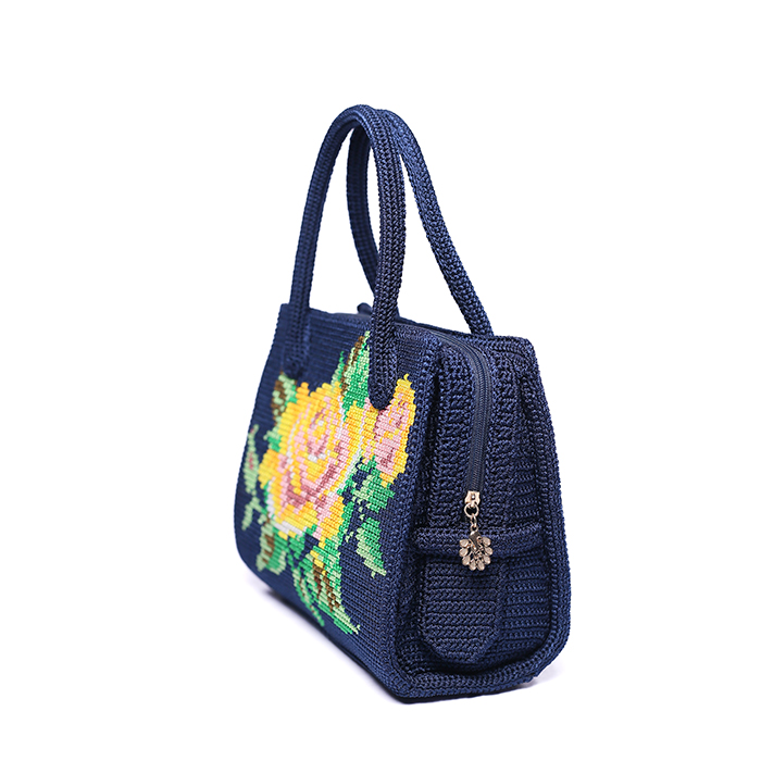 Totebag Rajut ini terdiri dari sisi depan dan belakang yang dibuat dari lembaran jaring grid bulat plastik yang disulam dengan teknik kristik (cross stitch) dengan motif Bunga. Bagian sisi kiri, kanan dan alas dibuat dari rajutan berupa lembaran dan kemudian disatukan dan dibentuk menjadi tas cantik.