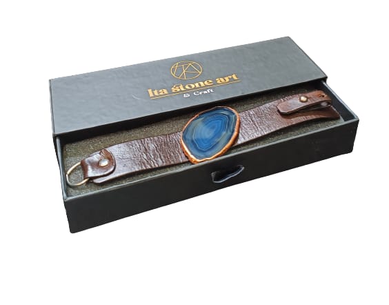 Perpaduan batu agate yang dipotong tipis dan kulit sapi asli. Batu agate dipercaya memberikan keseimbangan tubuh dan membuang energi negatif.