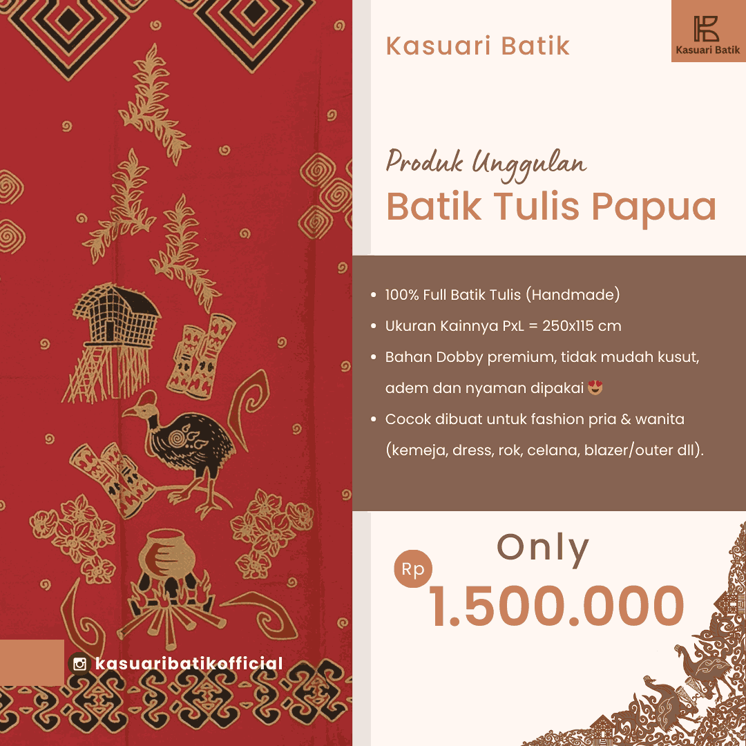 Kasuari Batik adalah brand produk unggulan yang memproduksi batik dan tenun papua. Kami adalah pelopor dalam memproduksi batik papua sejak tahun 2006 hingga saat ini. Motif batik & tenun terinspirasi dari budaya, keindahan alam dan keberagaman flora serta fauna endemik yang ada di Tanah Papua. Batik & Tenun kami buat secara "handmade" dan "limited edition" dari tangan para pengrajin yang berpengalaman.