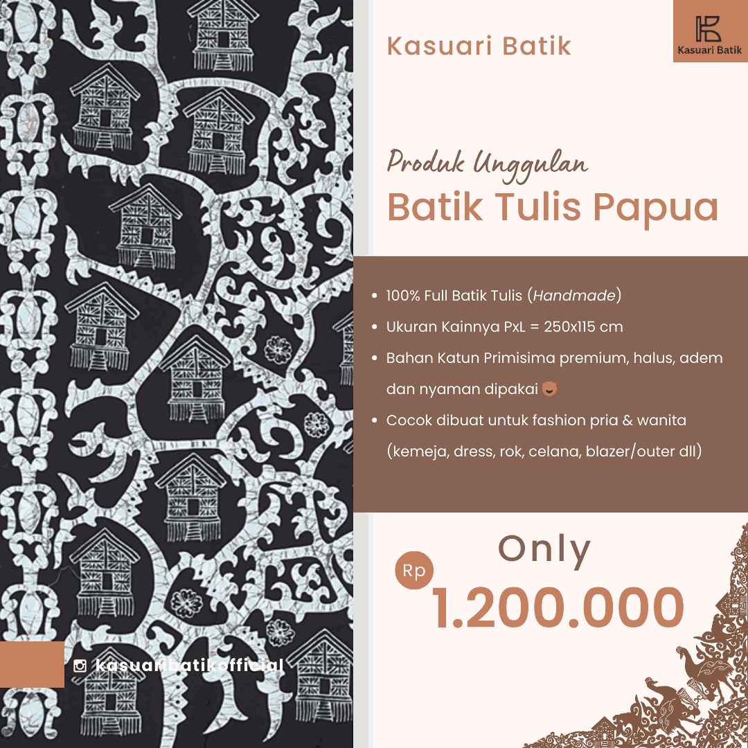 Kasuari Batik adalah brand produk unggulan yang memproduksi batik dan tenun papua. Kami adalah pelopor dalam memproduksi batik papua sejak tahun 2006 hingga saat ini. Motif batik & tenun terinspirasi dari budaya, keindahan alam dan keberagaman flora serta fauna endemik yang ada di Tanah Papua. Batik & Tenun kami buat secara "handmade" dan "limited edition" dari tangan para pengrajin yang berpengalaman.