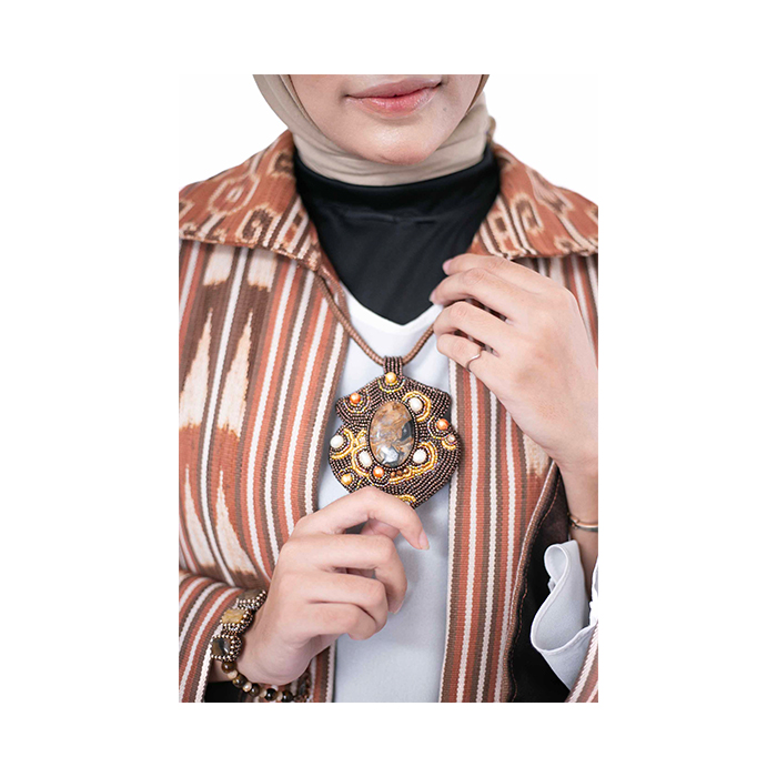 Kalung elegan dari batu alam Fosil, kristal, Mutiara air tawar dan payet Jepang, dibuat dengan teknik cabochon bead embroidery. Dihiasi mote dan kristal yang dijahit satu per satu dengan benang khusus beading sono dan finishing kulit sintetis tebal. Bentuk mata kalung yang unik dan kombinasi warna senada memberikan desain yang elegan. Hindari parfum atau body lotion, dan anginkan selama 5 menit setelah digunakan. Tampil menawan dengan kalung yang memadukan keanggunan dan keunikan