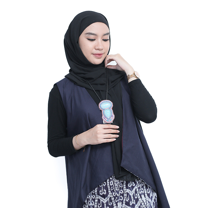 Jenis Bahan: Syal tenun songket Sambas, batu alam obsidian, batu bulat cat eyes, kristal, payet, lapisan belakang kulit sintetis tebal, peniti dan rantai kalung kulit sintetis.