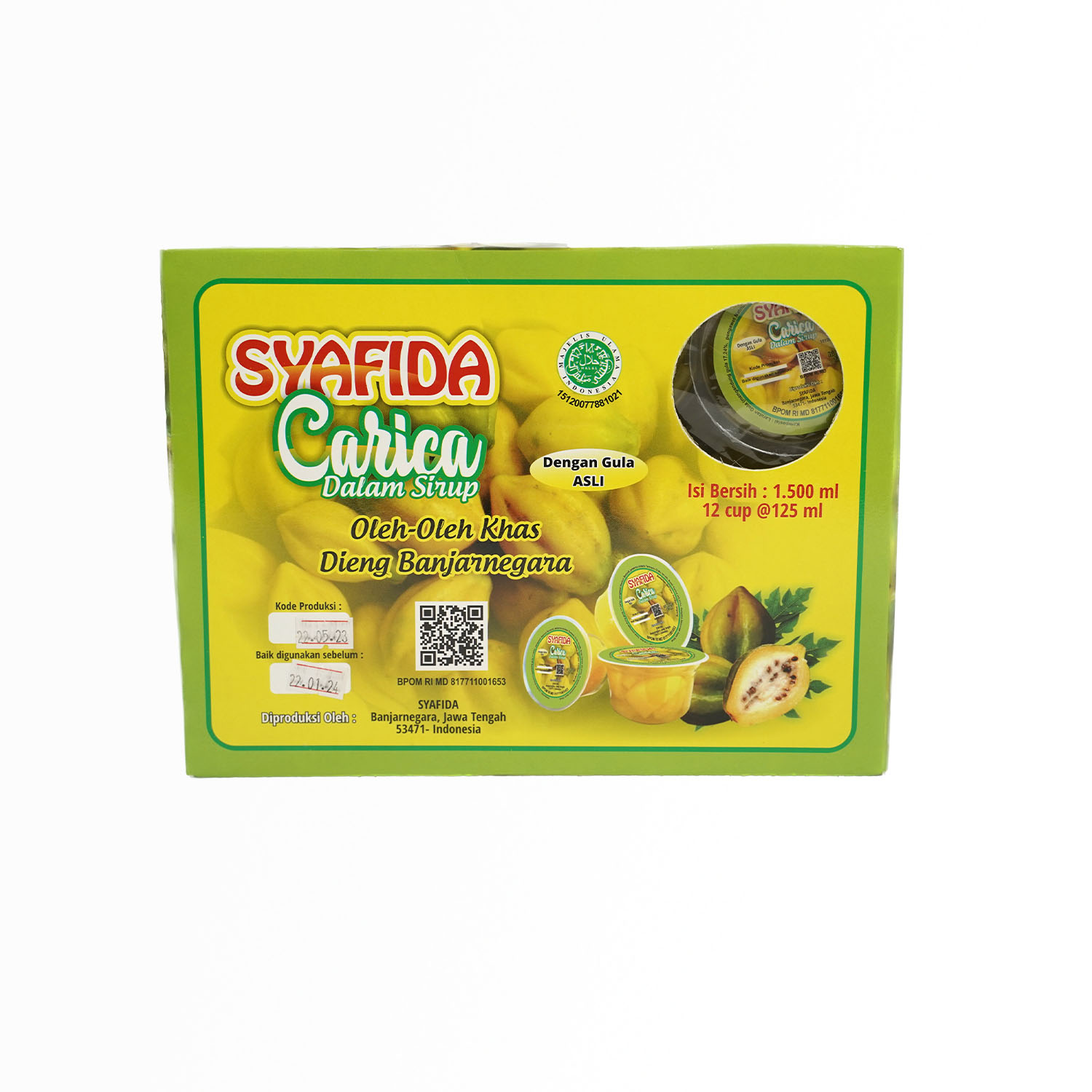 Kandungan Bahan: Buah Carica, Larutan Gula (mengandung gula 17,24% , pengawet Natrium Benzoat, Pewarna Sintetis Tartrazin, Pengaturan Keasaman Asam Sitrat)