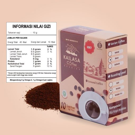 Kailasa Coffee adalah Kopi Indikasi Geografis Kopi Arabika Pegunungan Dieng Banjarnegara. Ditanam pada Ketinggian 1.200 Mdpl dengan mayoritas varietas lini s 795. Lokasi tanam di lereng pegunungan Bismo termasuk kawasan Dataran Tinggi Dieng. Diolah dengan berbagai proses pengolahan biji kopi yang tepat, dengan aroma yang khas, rasa yang pas, serta varian dalam proses pengolahan mencipakan kopi khas Nusantara yang berkualitas. Bahan Baku Cherry Merah, Biji premium terpilih, Specialty Coffee, sangrai segar, profil sangrai light ke medium, Standar grinding medium ke fine, 100 % Kopi arabika , murni dan natural, bergaransi, PIRT dan bersertifikat Halal, terdaftar di DJKI.