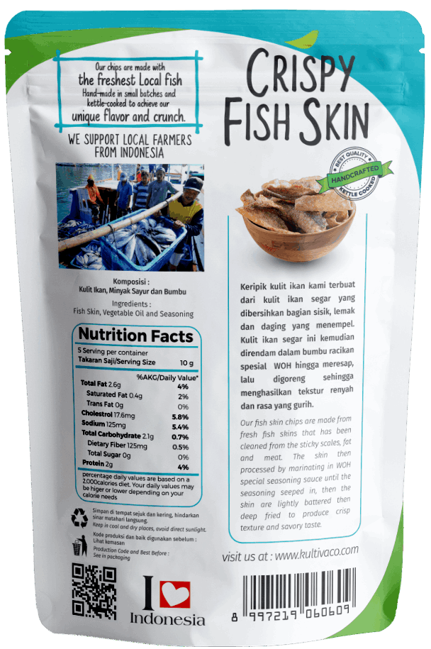 Kandungan Bahan: Kulit ikan dori, bawang putih, merica, cuka, garam, bubuk jamur, minyak goreng nabati