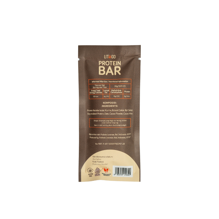 Kandungan Bahan: Soy isolated protein, dates, cacao powder, cacao nibs
