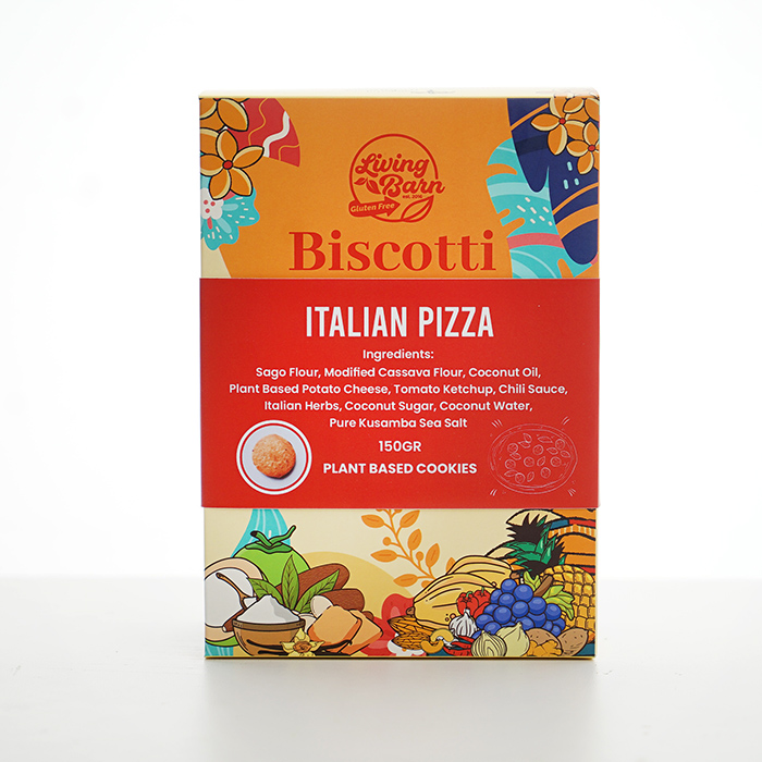 Kue kering nabati, pilihan camilan sehat alami bebas gluten yang dapat dikonsumsi segala usia. Berbahan baku aneka sumber nabati lokal terbaik asli Indonesia, seperti tepung sagu dan tepung singkong berkualitas tinggi, sehingga membantu menghidupkan perekonomian para petani dan artisan berdedikasi. Manis alami dari gula kelapa dalam jumlah minimal membuat produk ini aman dikonsumsi bagi Anda yang membatasi asupan gula. Italian Pizza Biscotti diperkaya dengan aneka kebaikan keju nabati berbasis kentang yang bermanfaat untuk kesehatan pencernaan,saraf dan otak, jantung, serta kesehatan pembuluh darah. Kandungan tomat, cabai, dan aneka rempah seperti oregano, basil serta bawang putih, turut menambah kebaikan dan citarasa dari produk ini. 1% dari nilai penjualan produk ini disumbangkan untuk edukasi masyarakat tentang penyakit autoimun dan pentingnya penerapan pola hidup sehat.