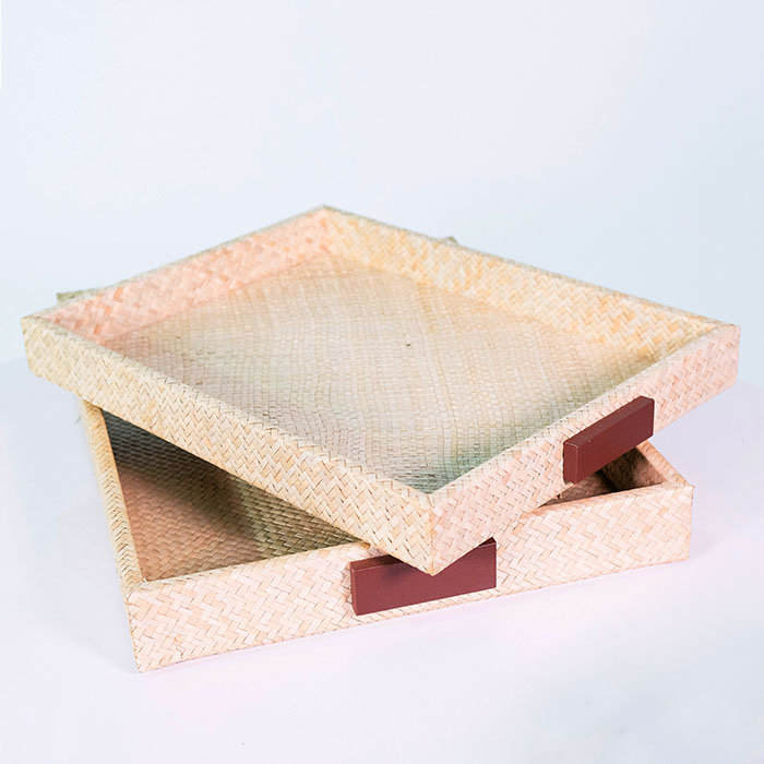 Produk terbuat dari material pandan kepang yang kemudian di rangkai ke dalam bingkai nampan untuk menambah tekstur dan warna natural yang dapat berfungsi sebagai nampan fungsional maupun sebagai dekorasi.
