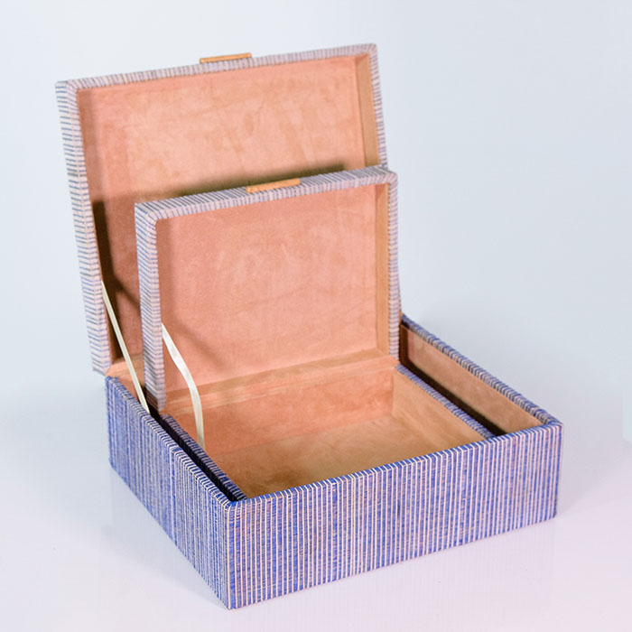 Decoration box terbuat dari tenun mendong yang kemudian diaplikasikan pada rangka box. Berfungsi secara fungsional sebagai tempat penyimpanan dan juga dapat digunakan sebagai dekorasi pelengkap ruang.