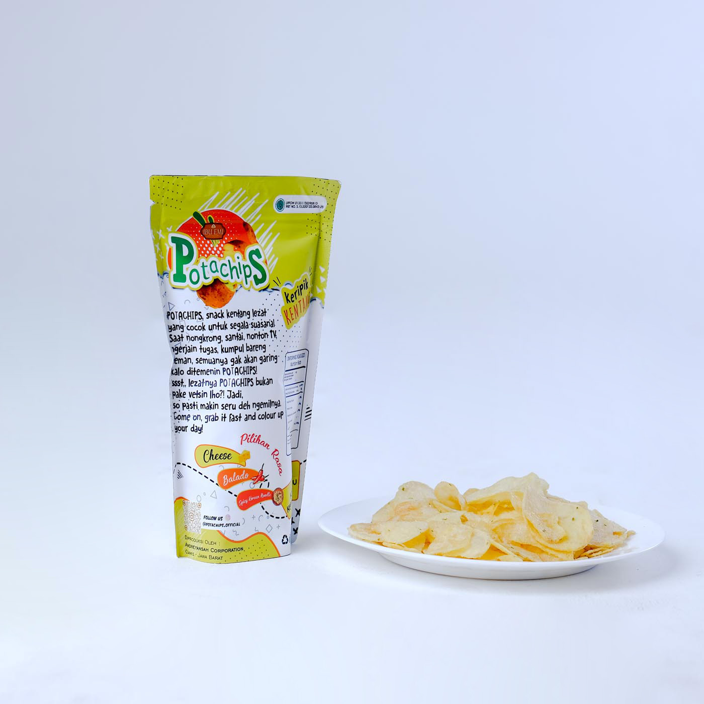 | Potachips adalah keripik kentang berkualitas yang diiris tipis sehingga tekstur nya renyah dan rasa kentangnya tetap terjaga, berpadu dengan bumbu tanpa penguat rasa, sehingga aman untuk anak anak. |