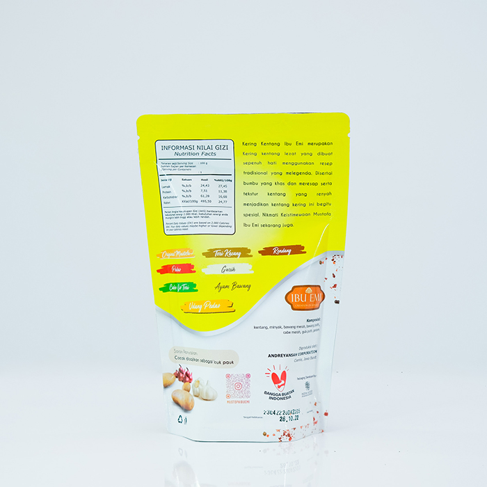 Kering Kentang Mustofa Ibu Emi adalah makanan yang terbuat dari kentang pilihan dan bumbu rempah alami sehingga menjadikan mustofa ibu emi satu satunya Kering Kentang yang renyah dan tahan lama dengan variasi rasa yang beragam.
