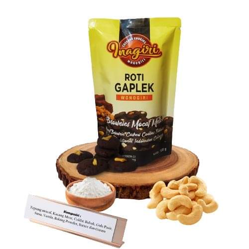 Cookies Gluten Free Inagiri Brownis Mete merupakan kue kering yang terbuat dari bahan baku 100 % tepung mocaf dipadu menggunakan coklat asli dan mete diolah menggunakan teknologi mesin automatic cookies yang terstandar food grade dan hygenis sehingga menghasilkan camilan sehat,