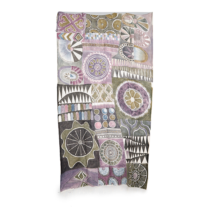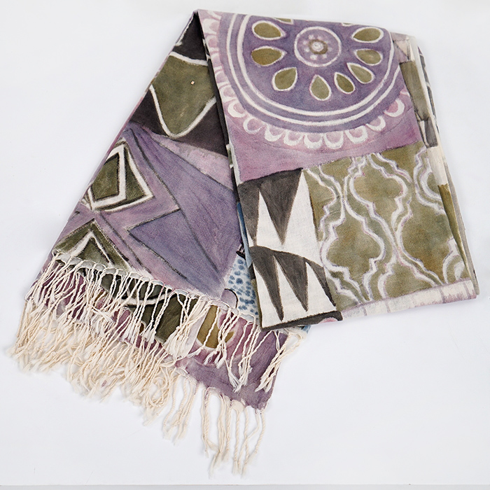 Makna Motif: Selendang lukis ini dibuat dengan teknik lukis menggunakan tinta warna alam. Motif ini terinspirasi dari bentuk-bentuk geometris yang dimodifikasi.