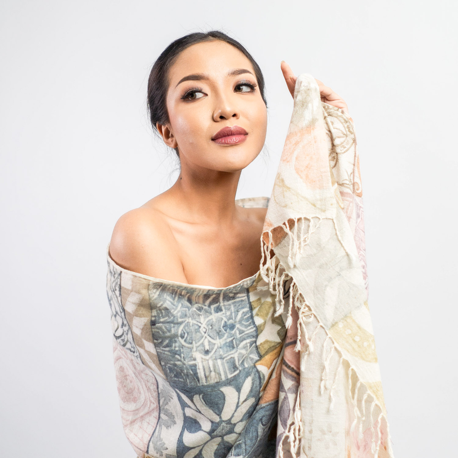 Makna Motif: Painted scarf ini dibuat dengan teknik lukis menggunakan tinta warna alam. Motif ini terinspirasi dari bentuk-bentuk geometris yang dimodifikasi.