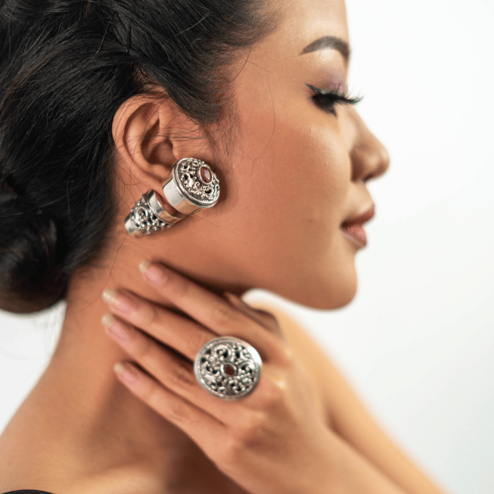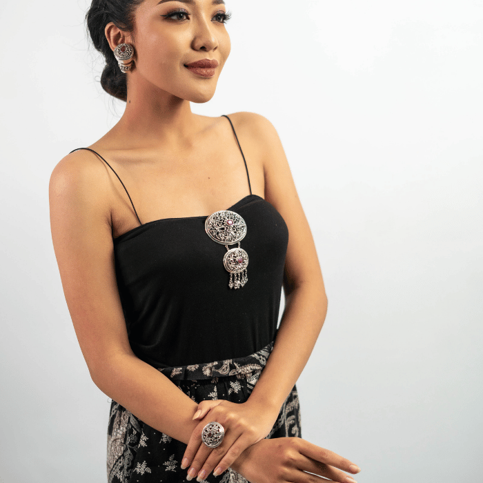Set Sriwijaya hadir menggunakan material perak yang ditatah dengan ornamen strilisasi patra punggel yang menjadi ciri khas daerah Celuk Sukawati. Perhiasan dengan motif karang patra punggel masih menjadi daya tarik tersendiri, dilihat dari ornamen yang dibuat dengan teknik tetatahan tradisional yang kami padukan dengan batu rubi cut di tengah perhiasan. Set ini seperti mengarungi waktu, mengajak kita melihat bagaimana sebuah ornamen patra punggel ini tidak lekang oleh waktu, sebuah set yang tidak lekang oleh zaman dan akan selalu digunakan dari generasi ke generasi.
