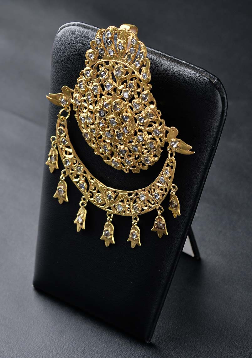 BROS BULAN MERUPAKAN BROS YANG TERBUAT DARI BAHAN TEMBAGA YANG DI LAPIS EMAS, REPLIKA BROS PENINGGALAN KHAS PALEMBANG YANG MENGGUNAKAN PERMATA KULIT INTAN YANG PROSES PEMASANGANNYA MENGUNAKAN METODE HANDMADE TATAH TEMPEL