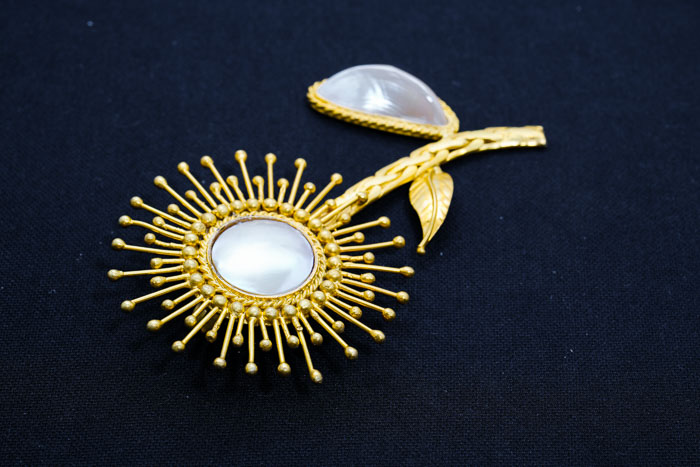 BROS INI TERINSPIRASI BENTUK MATAHARI DIGABUNGKAN DENGAN TUNGGAL DAUN DARI MABE, SEDANG DI ATAS BROSCH INI MENGGUNAKAN ARCU (SHELL)