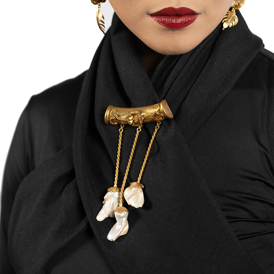 Perhiasaan ini bisa diaplikasikan menjadi liontin bros. bagian bawahnya adalah mutiara barok. ukiran yg ada ditabung adalah berbentuk daun bunga