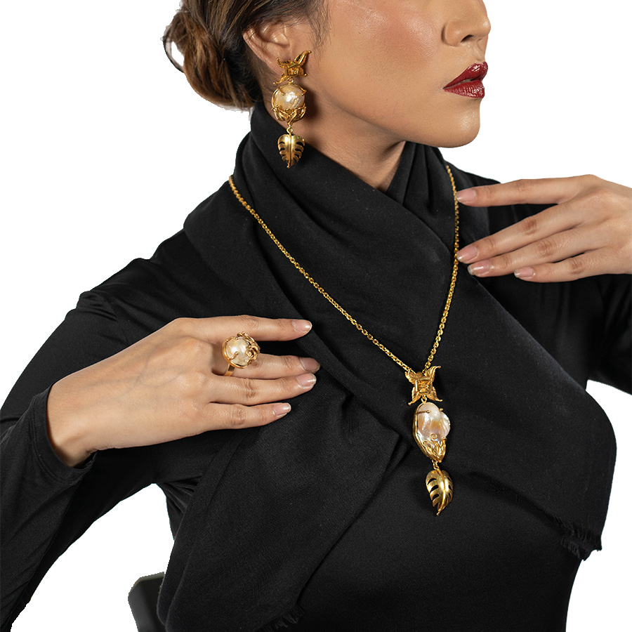 Mutiara barok yg dibentuk seperti daun monstera dhiasi dengan motif bunga ujung barok dan dibawahnya dihiasi daun dan prosesnya menggunakan teknik handmade tatah tempel