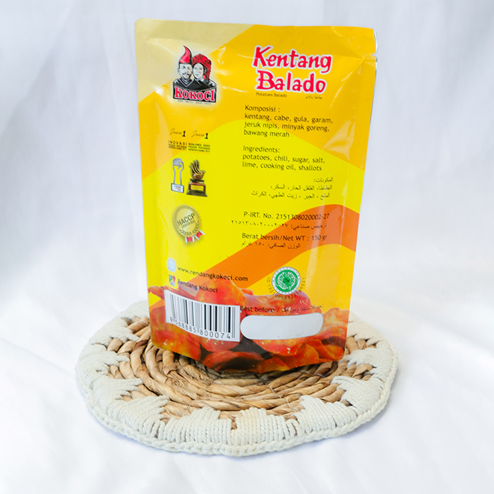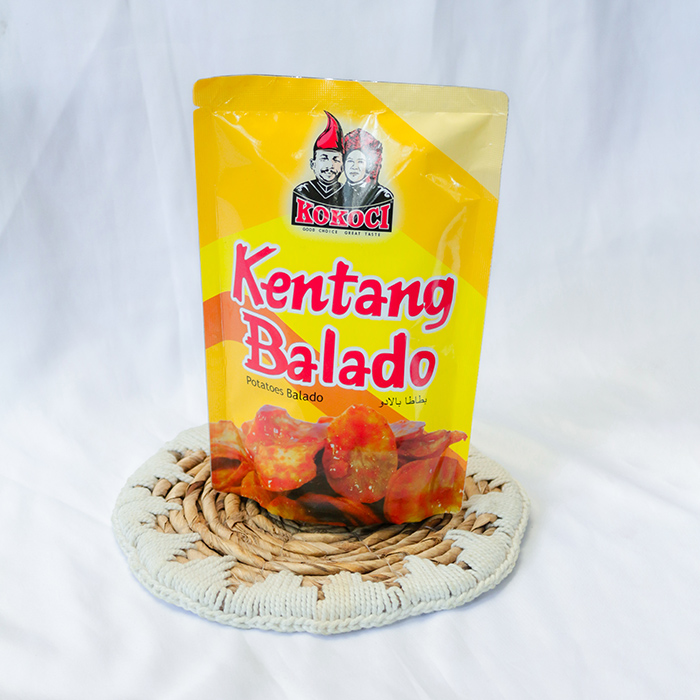 Kentang Balado merupakan produk olahan kentang yang di di iris tipis kemudian di goreng hingga renyah dan diberi bumbu balado khas minang sehingga memiliki rasa yang pedas manis dan aroma yang khas dari bumbu balado. Kentang balado ini memiliki masa simpan 6 bulan di suhu ruang.