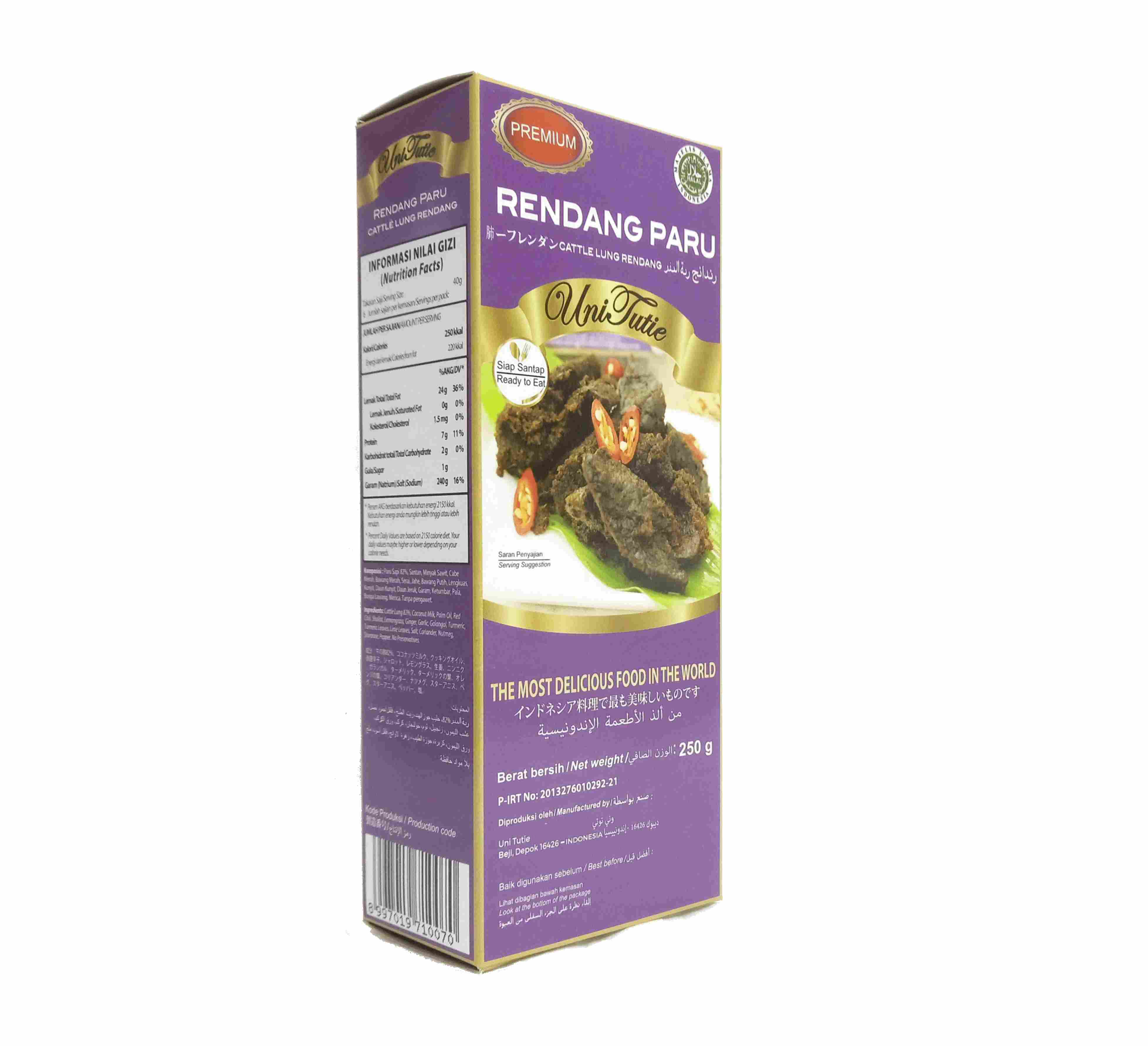 PT Rendang Uni Tutie memproduksi Rendang Daging Sapi Basah Rasa Asli Bukittinggi sejak November 2015. Rendang Sapi dikenal sebagai makanan asli Indonesia yang paling enak. Untuk mendapatkan cita rasa asli Rendang, kami menggunakan bahan baku lokal dan bumbu pilihan kualitas ekspor. Proses produksi menggunakan standar Good Manufacturing Practices dengan teknologi retort dan memiliki umur simpan 24 bulan pada suhu ruang. Kapasitas terpasang kami adalah 8 Ton Bumbu Rendang per bulan dan kami dapat segera meningkatkan kapasitas produksi kami sesuai dengan kebutuhan pembeli. Pembuatan produk Uni Tutie dari hulu ke hilir terjamin keamanan pangannya serta memiliki sertifikat HACCP dan Halal serta terdaftar di BPOM RI dan FDA di Amerika Serikat.