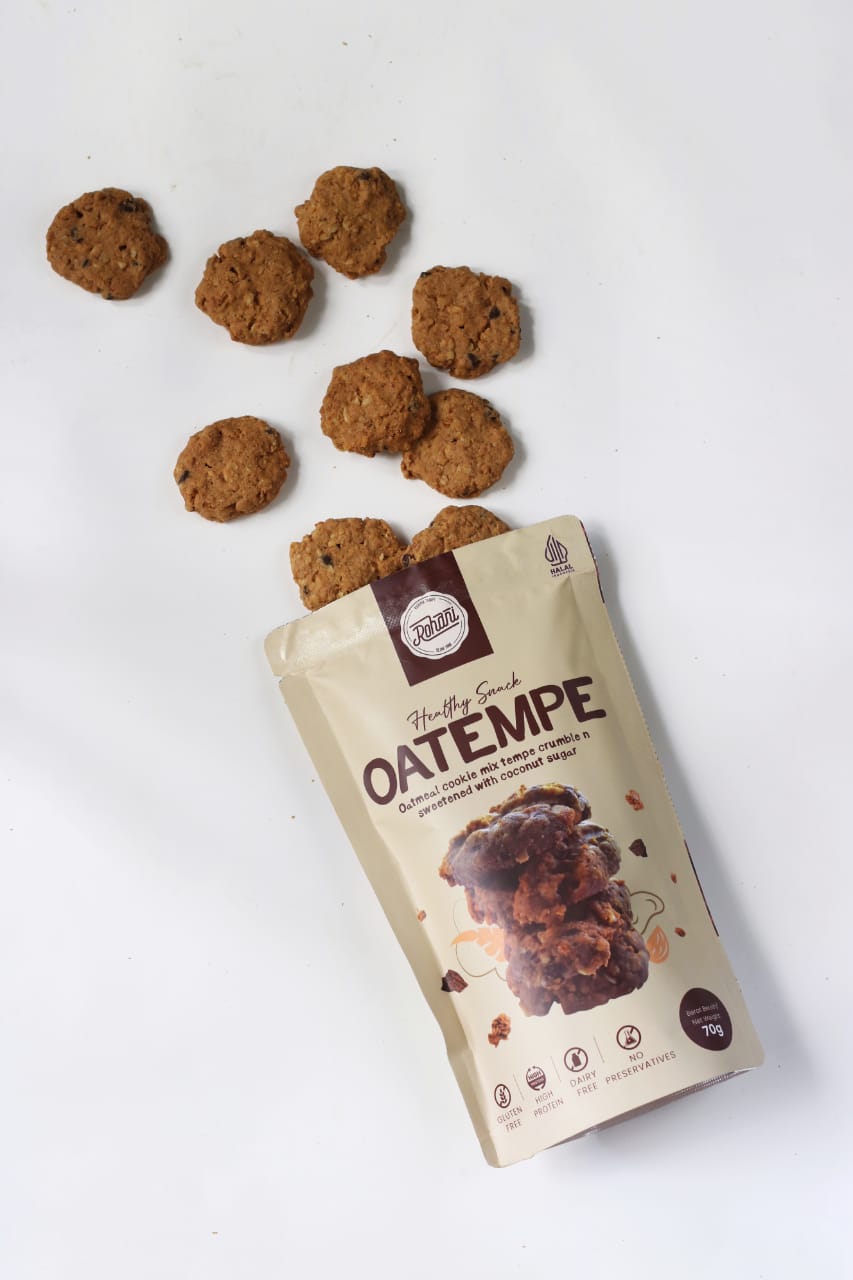 Oatempe Cookies perpaduan Tepung mocaf dengan gula palm dan tekstur yang renyah dari tempe crumble dan oat membuat rasa cookies ini unik.