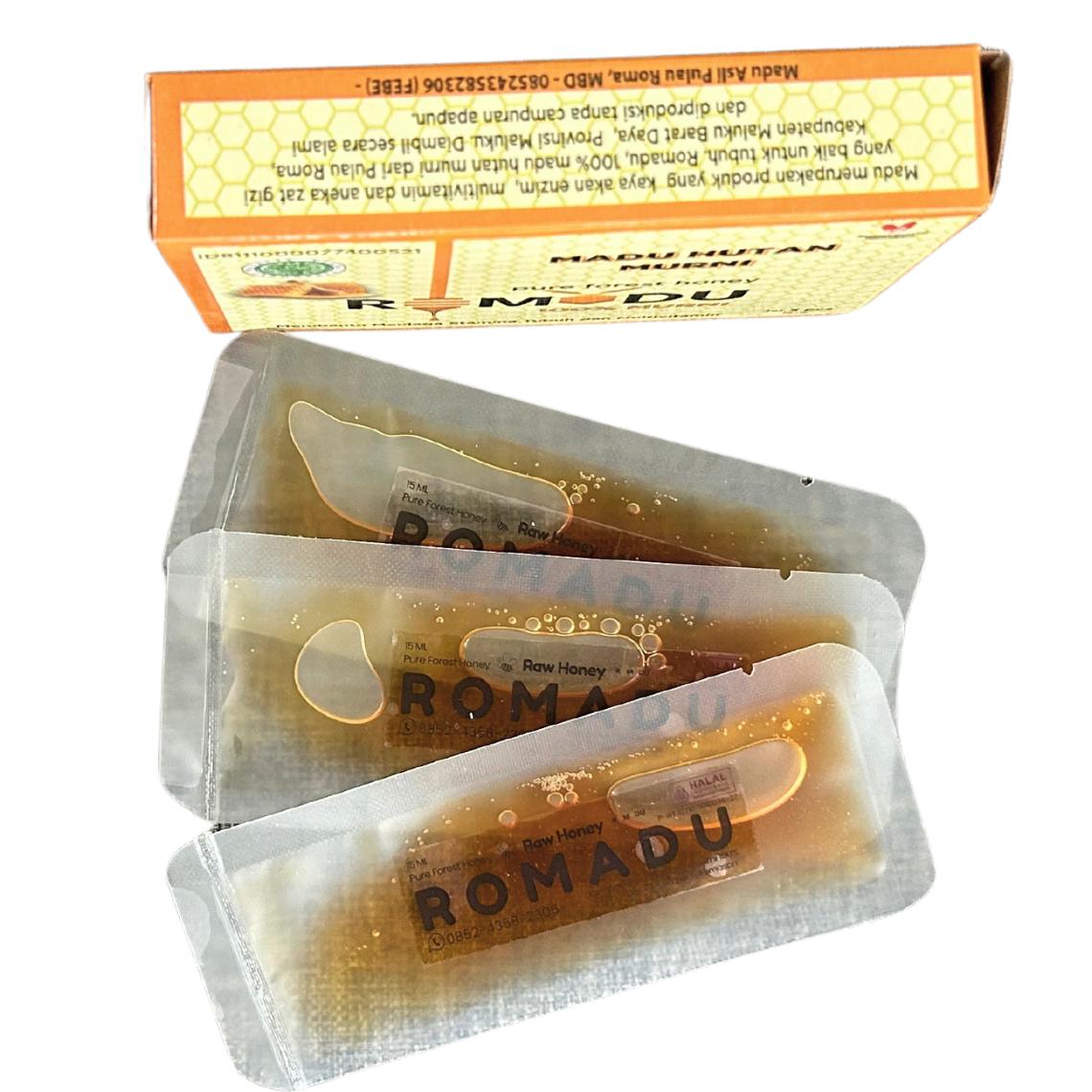 Diambil dari hutan Pulau Roma, Kabupaten Maluku Barat Daya Provinsi Maluku, ROMADU 100% murni madu hutan tanpa bahan pengawet. Madu ini diambil dari tebing-tebing yang curam di dalam hutan. Petani berjuang untuk mengambilnya dengan cara tradisional namun menjadi mata pencaharian turun-temurun. Dan menjadi mata pencaharian utama masyarakat setempat. Namun, nilai jual sangat rendah. Karena itu kami membuat madu dalam kemasan premium yang menggunakan kaca. Dan untuk menjangkau pasar lebih luas lagi, maka Romadu dikemas dengan kemasan yang ekonomis yaitu kemasan sachet isi 3.